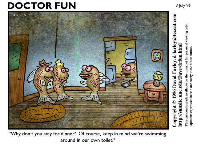 "Why don't you stay for dinner? Of course, keep in mind we're swimming around in our own toilet."