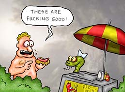 Striking out with the Tree of Knowledge, Satan hits a homer with the Sausages of Swearing